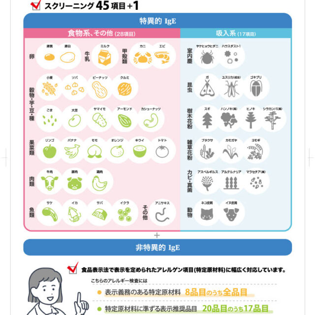 花粉やハウスダストなどアレルギーの原因があり、結膜の炎症、かゆみ、目やに、流涙等の症状が出ます。花粉は季節によって種類が異なり、春はスギやヒノキ、初夏はカモガヤやオオアワガエリ、秋はブタクサやヨモギが代表的です。当院では、指先からの微量採血で一度に45項目を調べることのできる「ゆびプチ」を採用しています。結果は数日でわかりますので、ご希望の方はお申し出下さい。